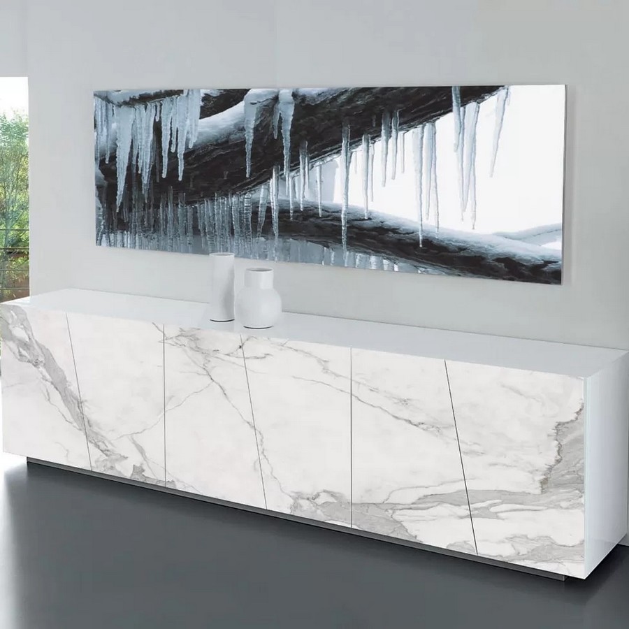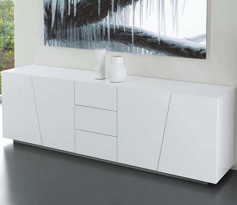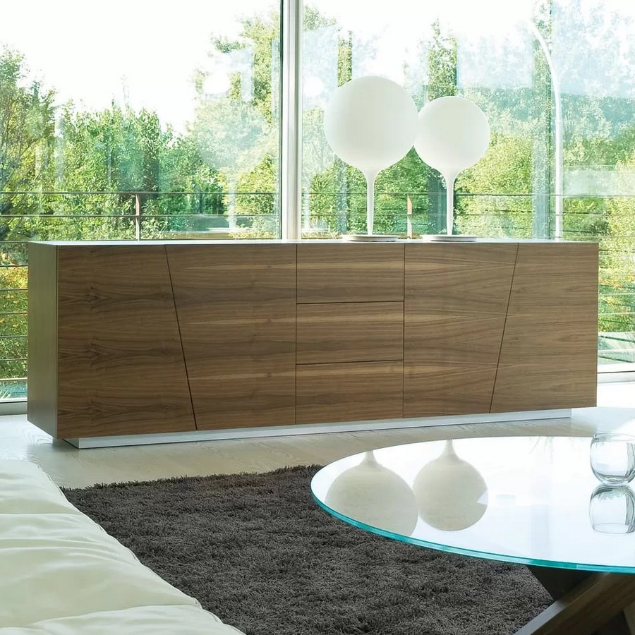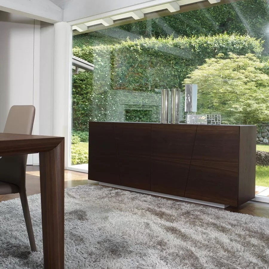 Designová komoda Parigi se 4 dvířky, popř. 3 zásuvkami s dotykovým otvíráním. Přírodní nebo lakovaný dřevěný korpus a dvířka. Uvnitř police z čirého skla. Základna z matného hliníku.
