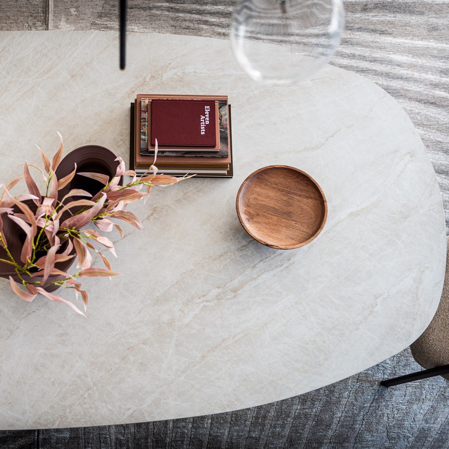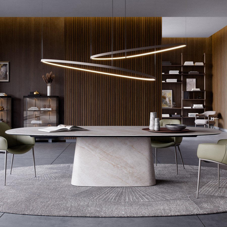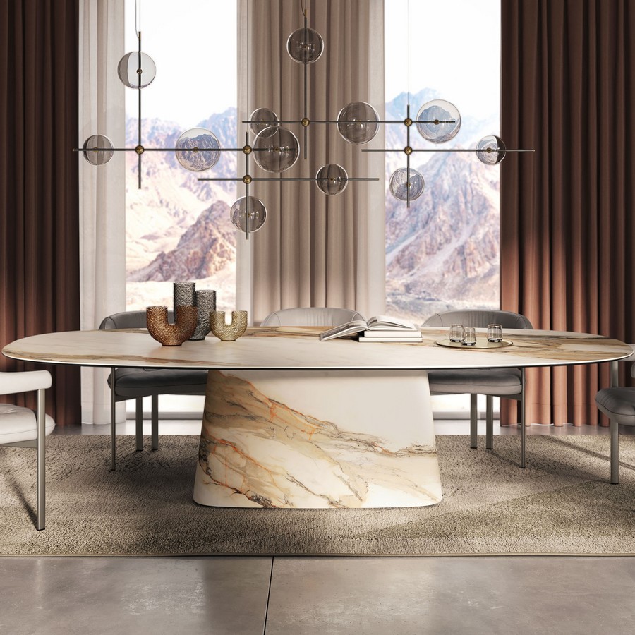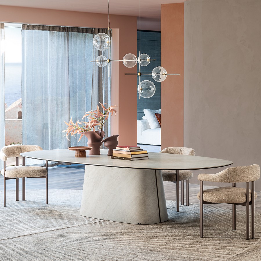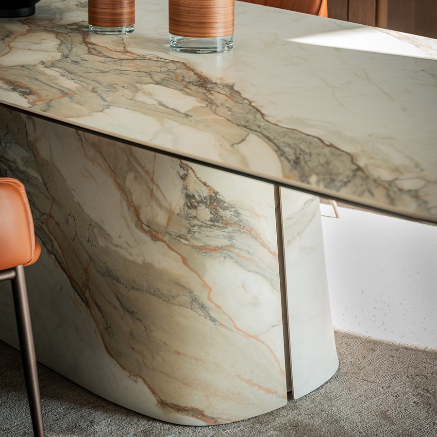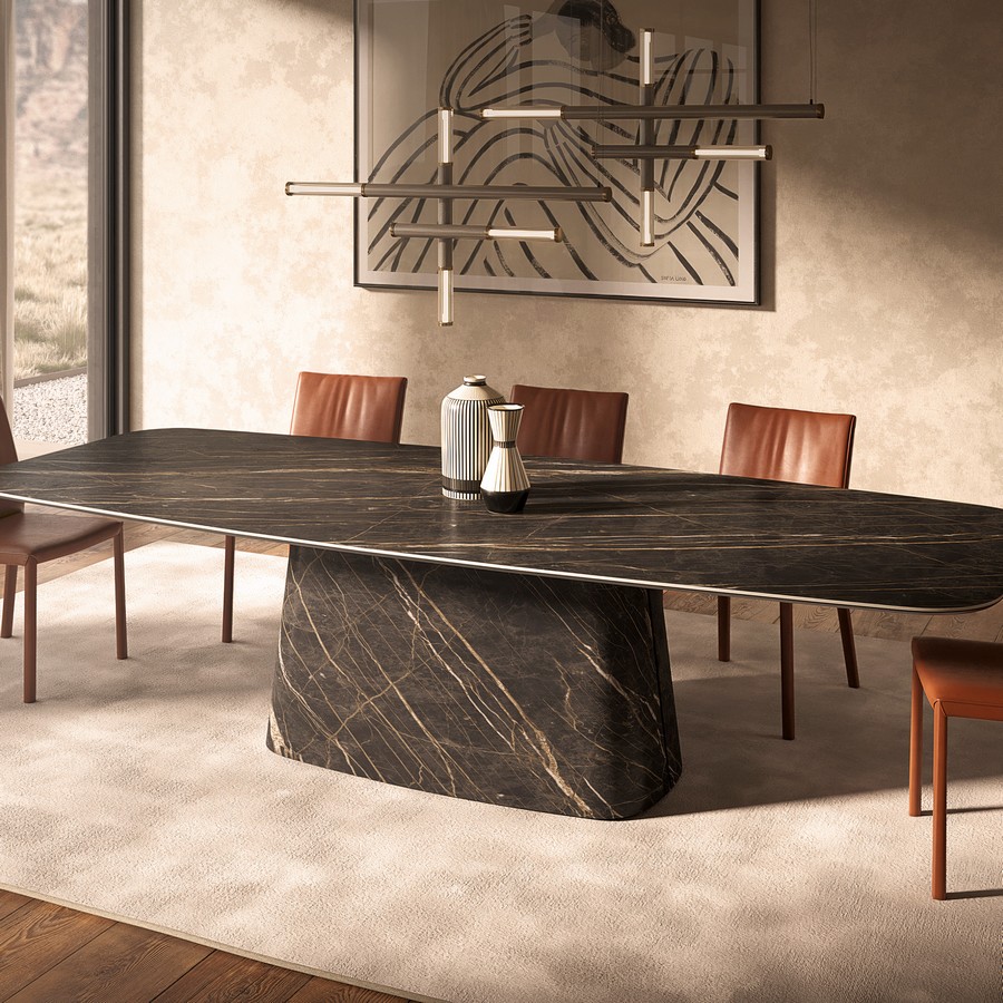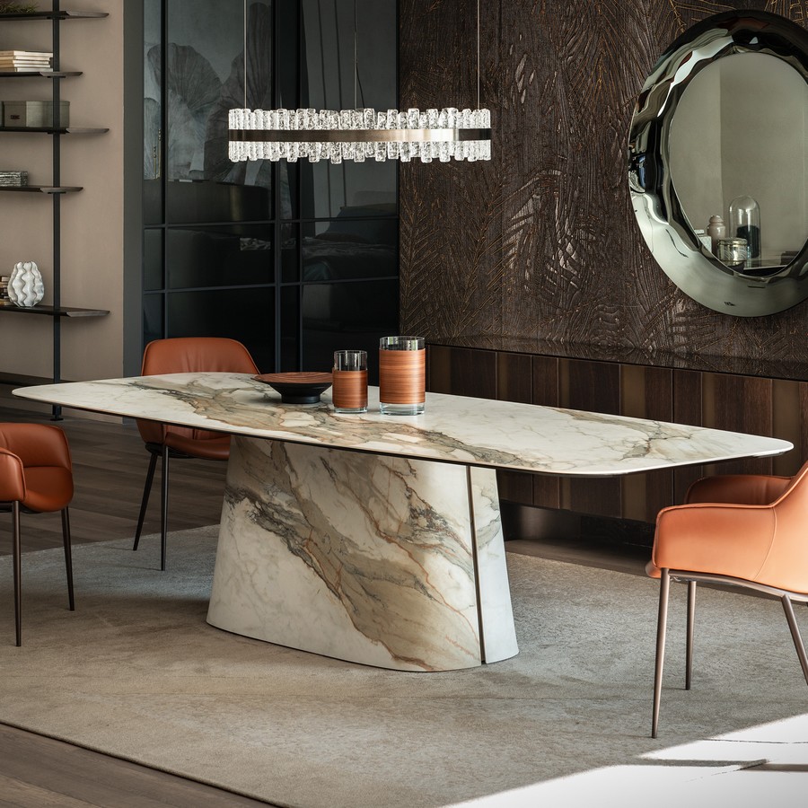Luxusní jídelní stůl Napoleon Keramik je dokonalým výsledkem moderního zpracování keramiky. Inovativní design je tvořen nejen z keramické desky, ale především tvarované keramické podnože. Na bočních stranách podnože je patrný drobný detail: zapuštěná drážka pokrytá též keramikou. Výsledkem je monumentální keramický stůl, který kombinuje klasické povrchové úpravy inspirované přírodním mramorem s novými a ojedinělými výrobními technikami.