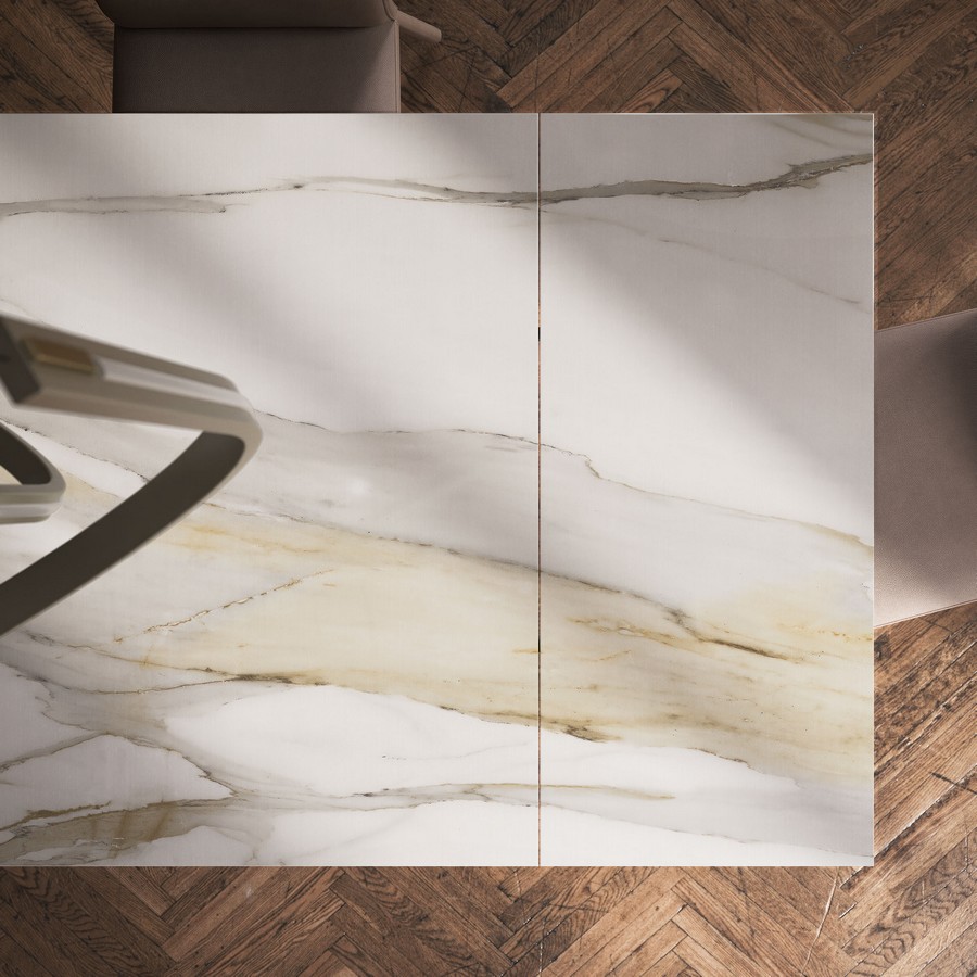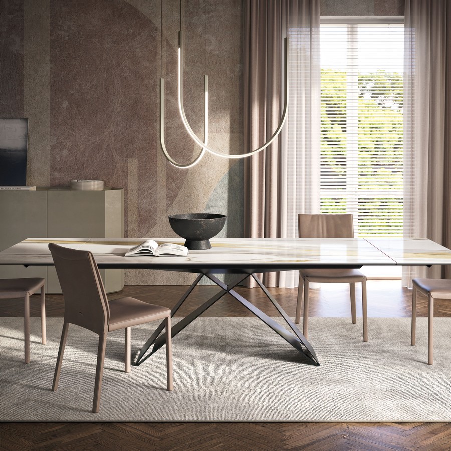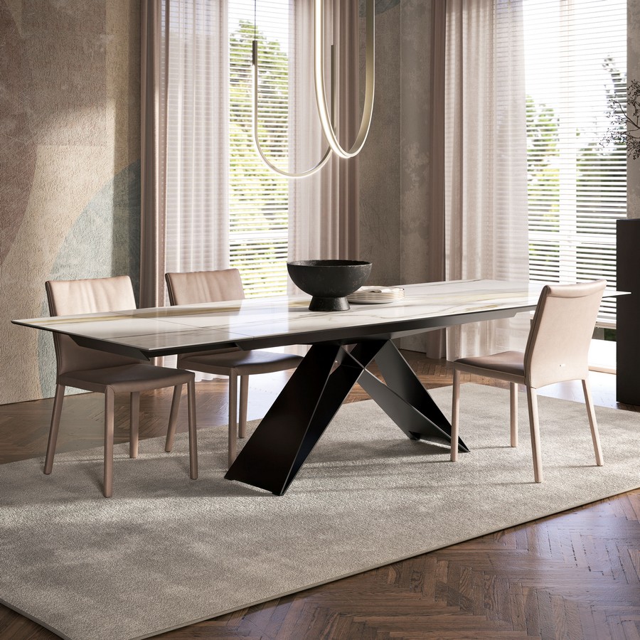 Designový rozkládací jídelní stůl Premier Keramik Drive zaujme horní deskou z odolné keramiky a netradičně řešenou podnoží z lakované oceli. Díky chytrému rozkládacímu mechanismu snadno vytvoříte více prostoru pro rodinu i hosty.