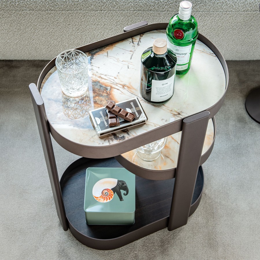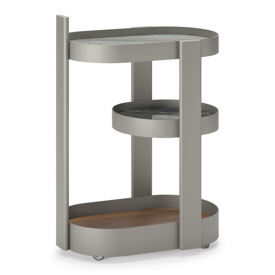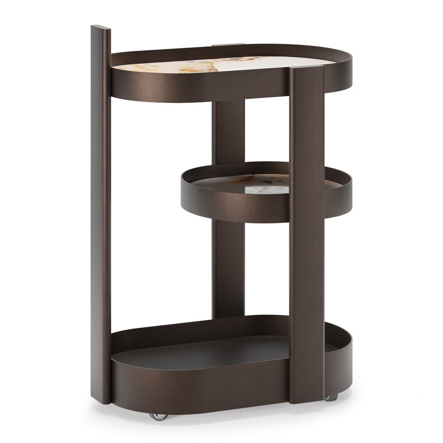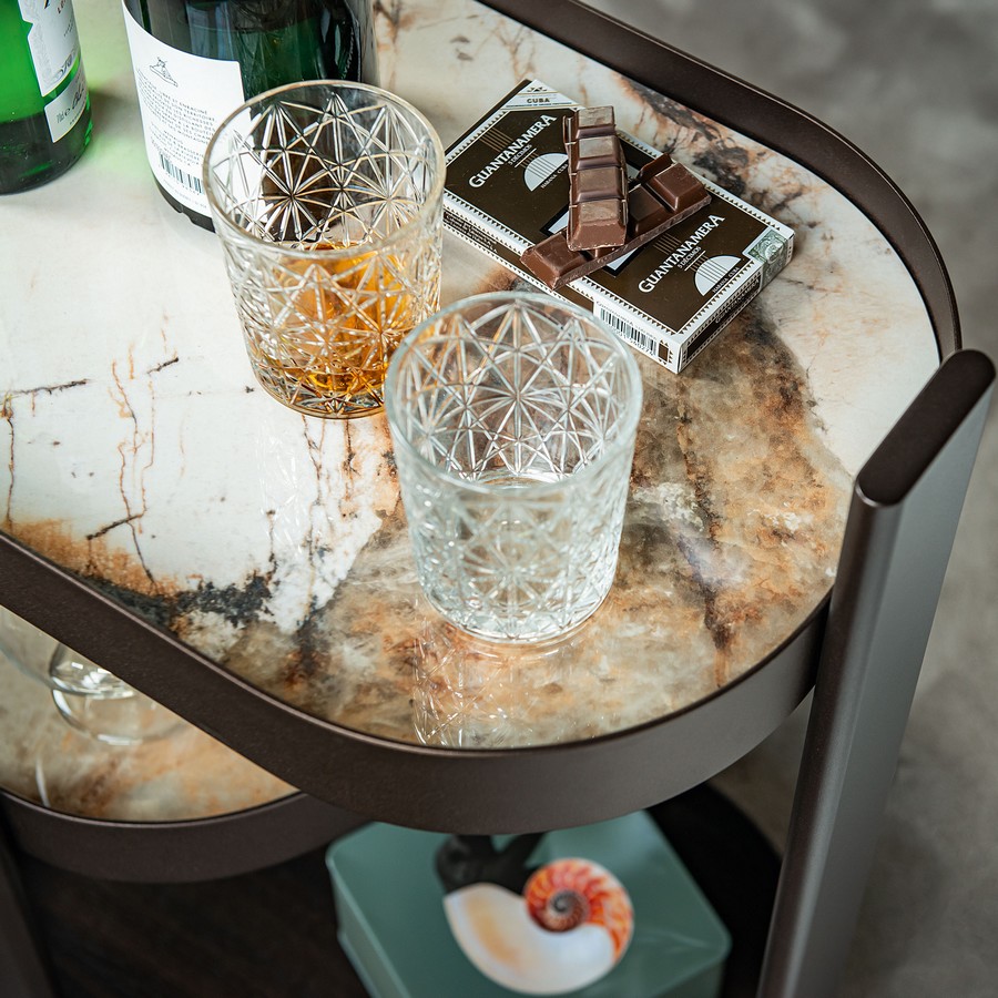 Designový servírovací vozík, neboli barový stůl Tonic, zaujme svým originálním tříúrovňovým uspořádáním, které působí elegantně a zároveň prakticky. Kovová konstrukce s integrovaným madlem a skrytými kolečky dodává stolu čistý, minimalistický vzhled. Kombinace keramiky, dřeva a kovu vytváří harmonický celek s výrazným dekorativním charakterem. Tonic je ideálním doplňkem pro stylové servírování i jako designový prvek moderního interiéru.