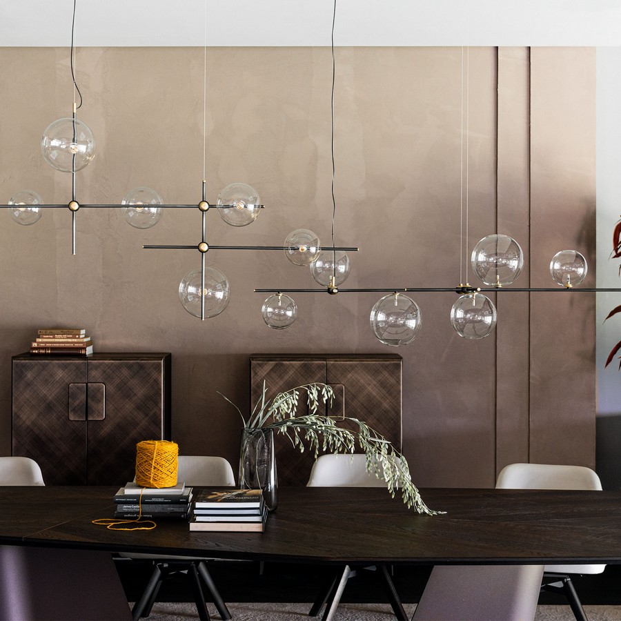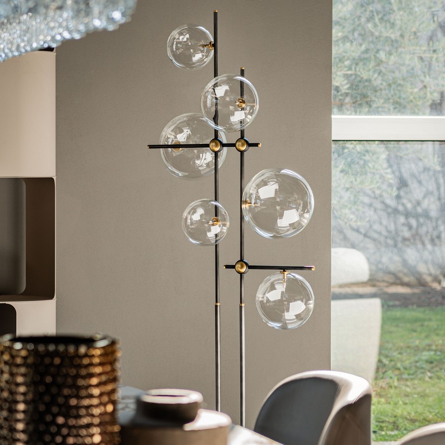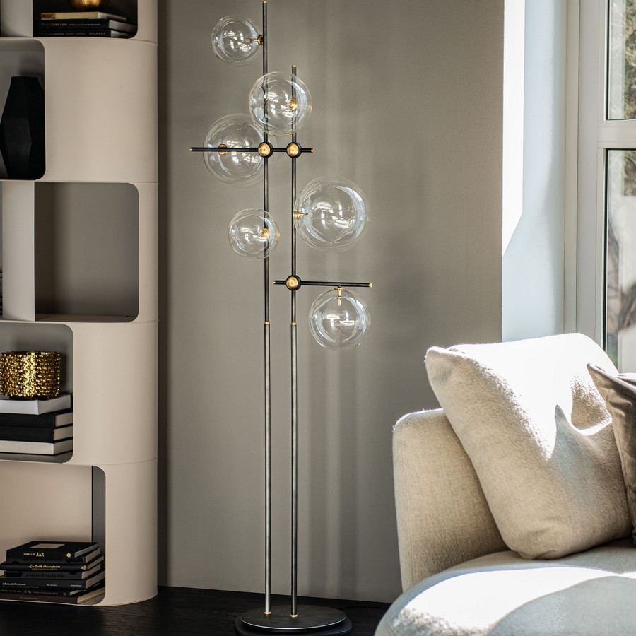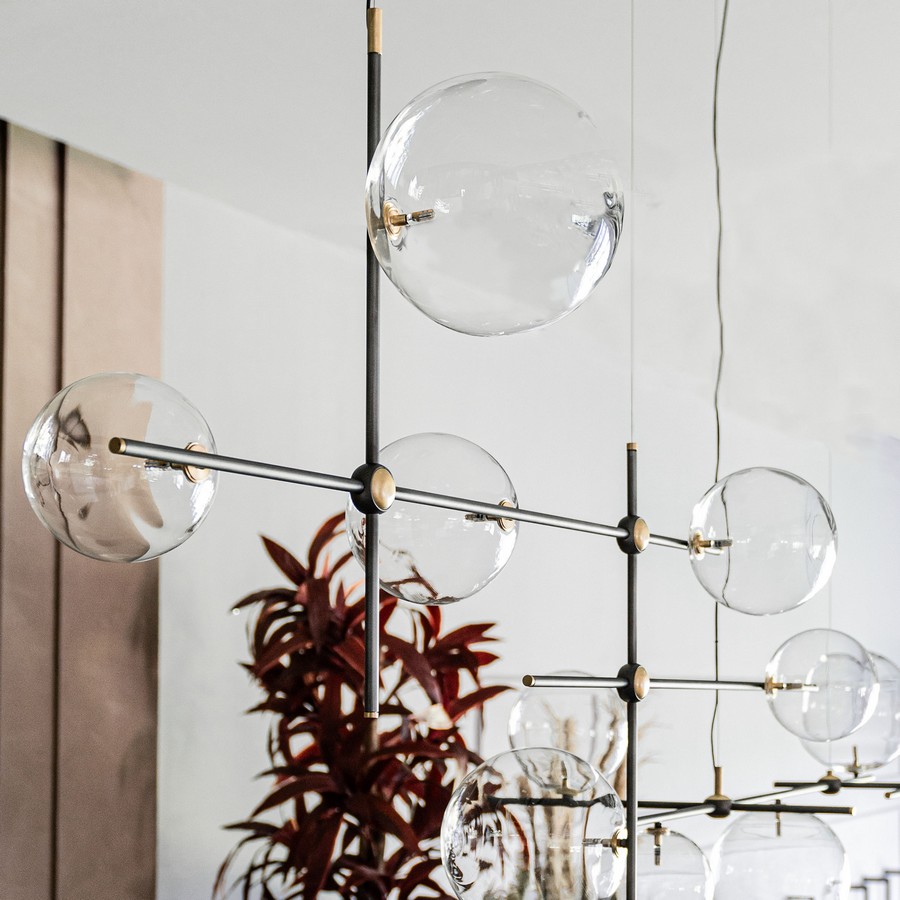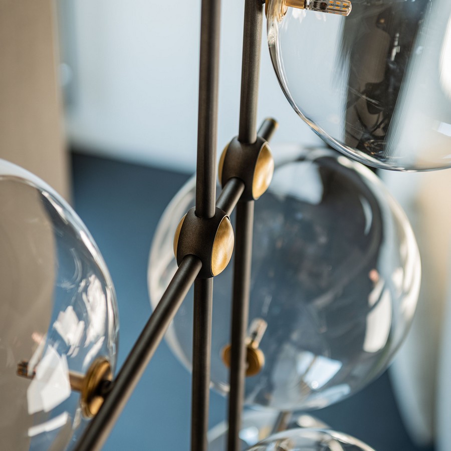 Moderní osvětlení Bloom je tvořeno kovovými částmi, na jejíchž koncích se tyčí 6 velkých křišťálových koulí. Spoje a konce osvětlení jsou navíc zdobeny další povrchovou úpravou z kartáčované mosazi.
